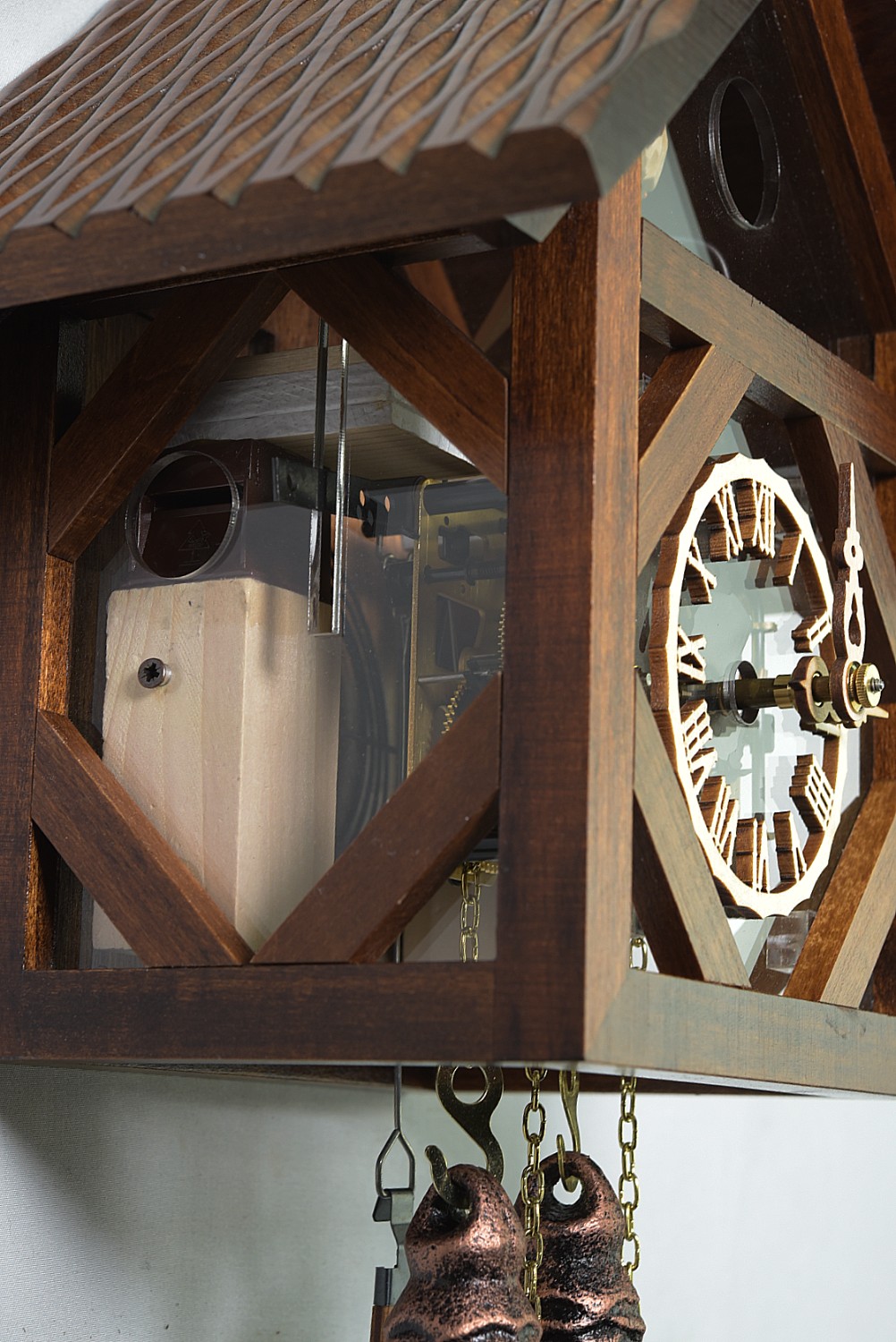 機能性としましては、従来の鳩時計と同様に夜間の鳴り止め手動レバーが側面につきます
