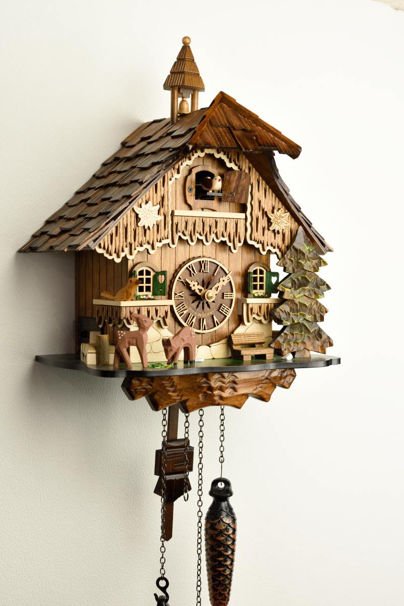ドイツにてハンドメイドされた伝統的な鳩時計の外装に、光センサーなどが付いた機能性が高いクォーツムーブメント(電池式)を内蔵した全く新しい鳩時計シリーズです。